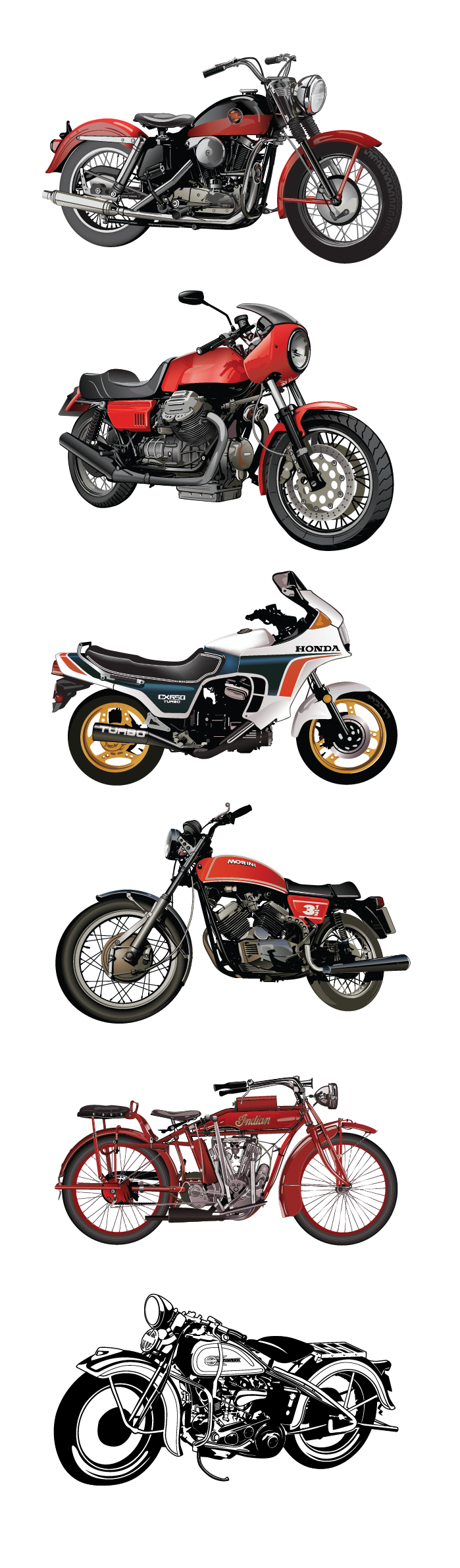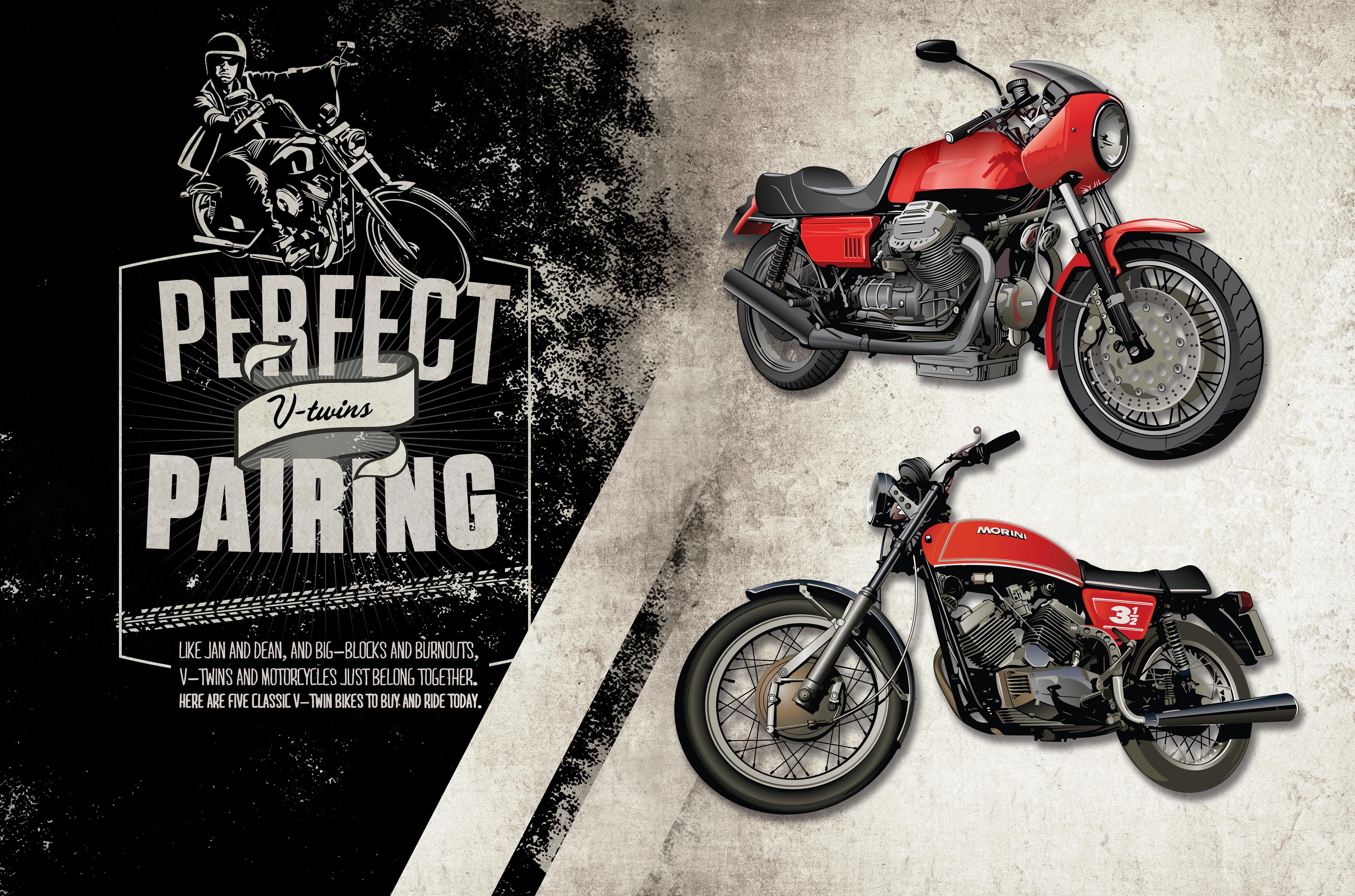 These illustrations were used for a Hagerty Classic Cars magazine article about V-Twin Motorcycles written by classic car automotive writer John L. Stein.
